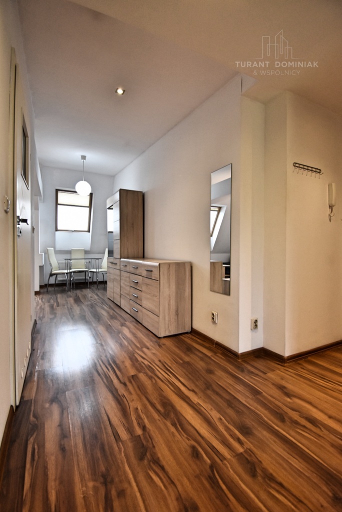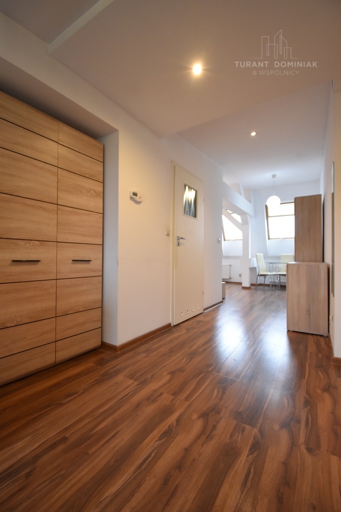 Przytulna i przestronna kawalerka do wynajęcia, zlokalizowana w samym Centrum Szczecina przy skrzyżowaniu ulic Jagiellońskiej i Bolesława Śmiałego. Lokal o całkowitej powierzchni 31,87 m2 znajduje się na ostatnim piętrze w odrestaurowanej frontowej kamienicy. W ocieplonym budynku zainstalowano monitoring. W pobliżu liczne przystanki komunikacji miejskiej, centra handlowe, pływalnia oraz kluby fitness. W pełni umeblowane mieszkanie składa się z przestronnego salonu, otwartej kuchni, dużego przedpokoju oraz łazienki. Kuchnia została wyposażona w niezbędny sprzęt AGD tj meble, płyta elektryczna, okap, zlewozmywak oraz lodówka z zamrażarką. W łazience kabina prysznicowa, na wyposażeniu znajdzie się również pralka. Ściany w pokoju i kuchni gładkie i malowane, na podłodze panele. Łazienka w glazurze i terakocie. Niewielki czynsz administracyjny w wysokości 409,59 zł jest atutem tej nieruchomości. Dodatkowym kosztem jest wyłącznie gaz oraz energia elektryczna wg zużycia. Ogrzewanie i ciepła woda z pieza gazowego dwufunkcyjnego. Wymagana kaucja w wysokości 2500 zł oraz umowa najmu okazjonalnego. Nieruchomość dla singla lub pary, nieposiadających zwierząt i niepalących. Lokal godny polecenia ze względu na kapitalną lokalizację w Centrum. Zapraszam serdecznie na prezentację nieruchomości.